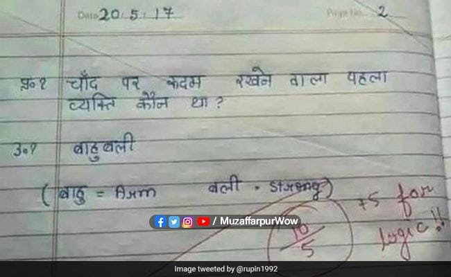 टेस्ट कॉपी पर सवाल है, चांद पर कदम रखने वाला पहला व्यक्ति कौन था ? उत्तर में लिखा है- बाहुबली। उसके नीचे बच्चे ने लिखा है- बाहु-Arm, बली-Strong। इस हिसाब से उसका उत्तर हुआ आर्मस्ट्रॉन्ग। जोकि सही जवाब है। लेकिन बच्चे ने इसे एक स्टाइल के साथ लिखा, जिसके लिए टीचर ने उसे पांच और अतरिक्त नंबर दे दिए। ये फोटो आईपीएस अधिकारी रुपिन शर्मा ने अपने ट्विटर अकाउंट पर शेयर की है।