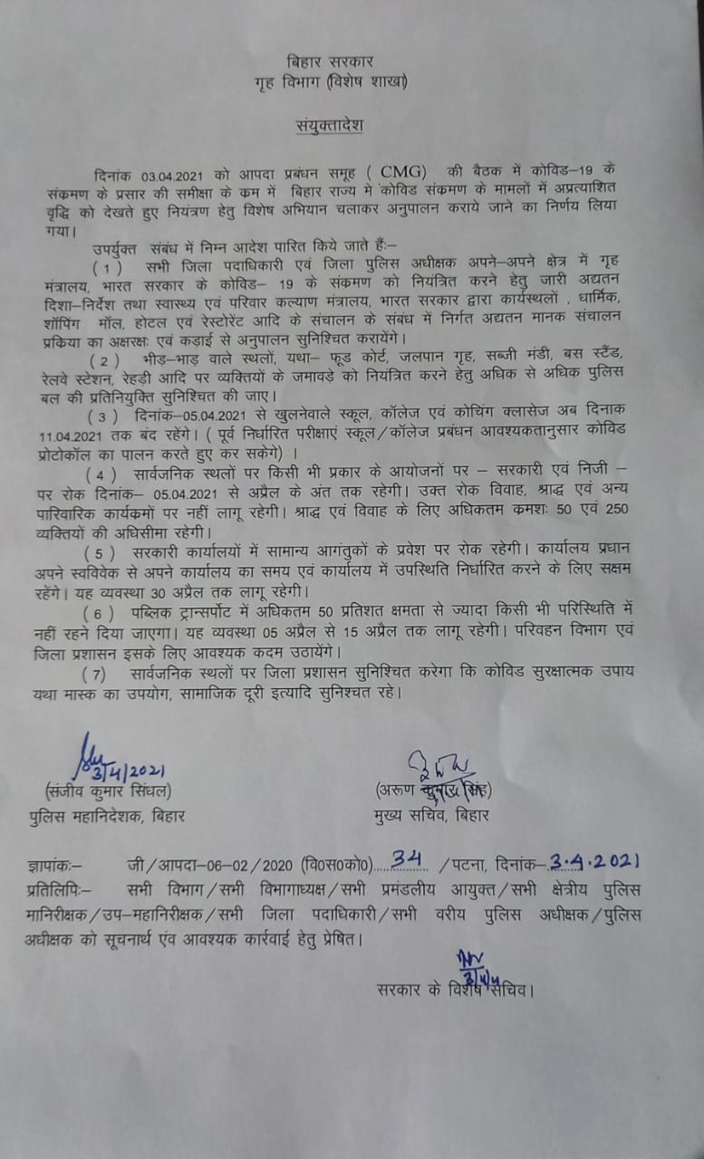 (3) दिनांक-05.04.2021 से खुलनेवाले स्कूल, कॉलेज एवं कोचिंग क्लासेज अब दिनाक 11.04.2021 तक बंद रहेंगे। ( पूर्व निर्धारित परीक्षाएं स्कूल/कॉलेज प्रबंधन आवश्यकतानुसार कोविड प्रोटोकॉल का पालन करते हुए कर सकेगे)